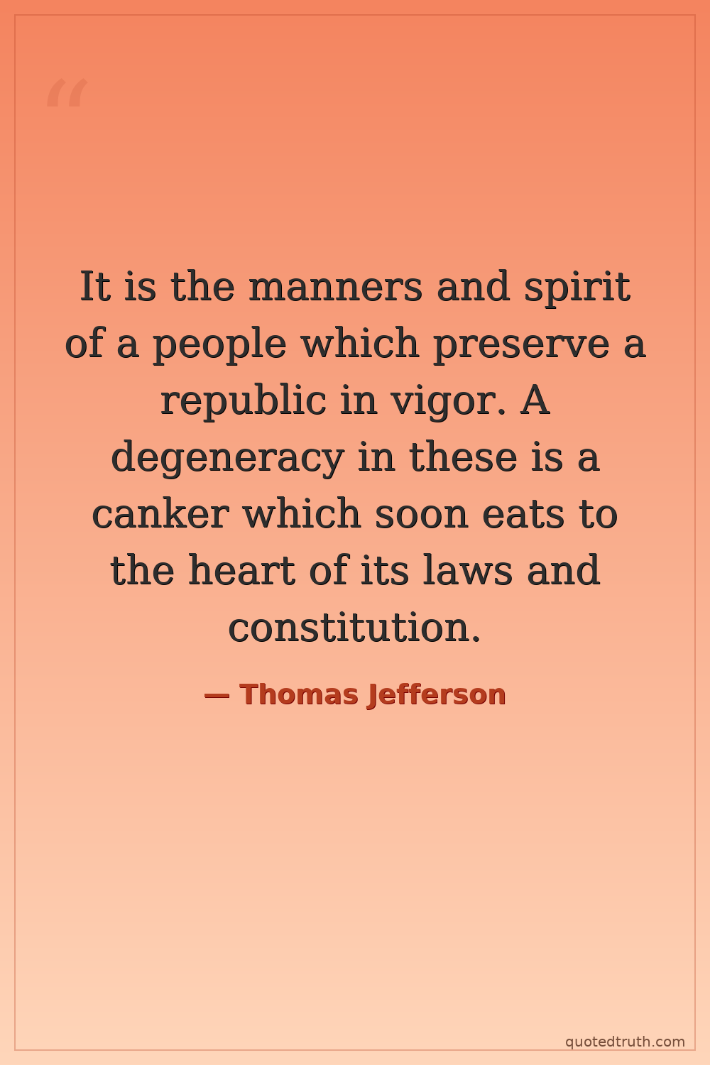 It is the manners and spirit of a people which preserve a republic in vigor. A degeneracy in these is a canker which soon eats to the heart of its laws and constitution.