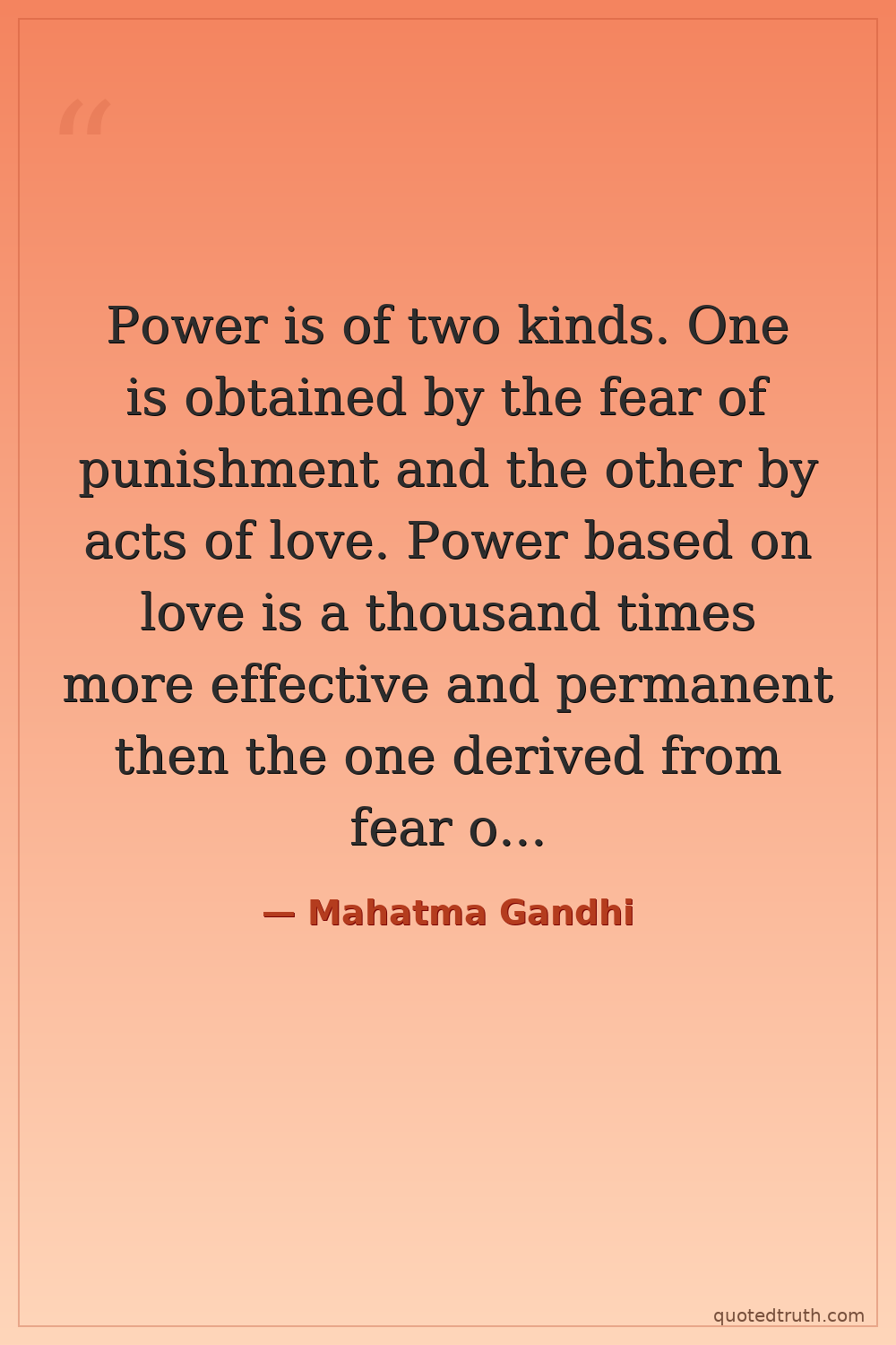 Power is of two kinds. One is obtained by the fear of punishment and the other by acts of love. Power based on love is a thousand times more effective and permanent then the one derived from fear of punishment.