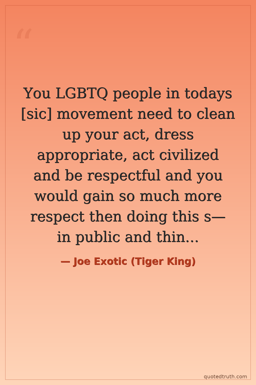 You LGBTQ people in todays [sic] movement need to clean up your act, dress appropriate, act civilized and be respectful and you would gain so much more respect then doing this s— in public and thinking your cute.