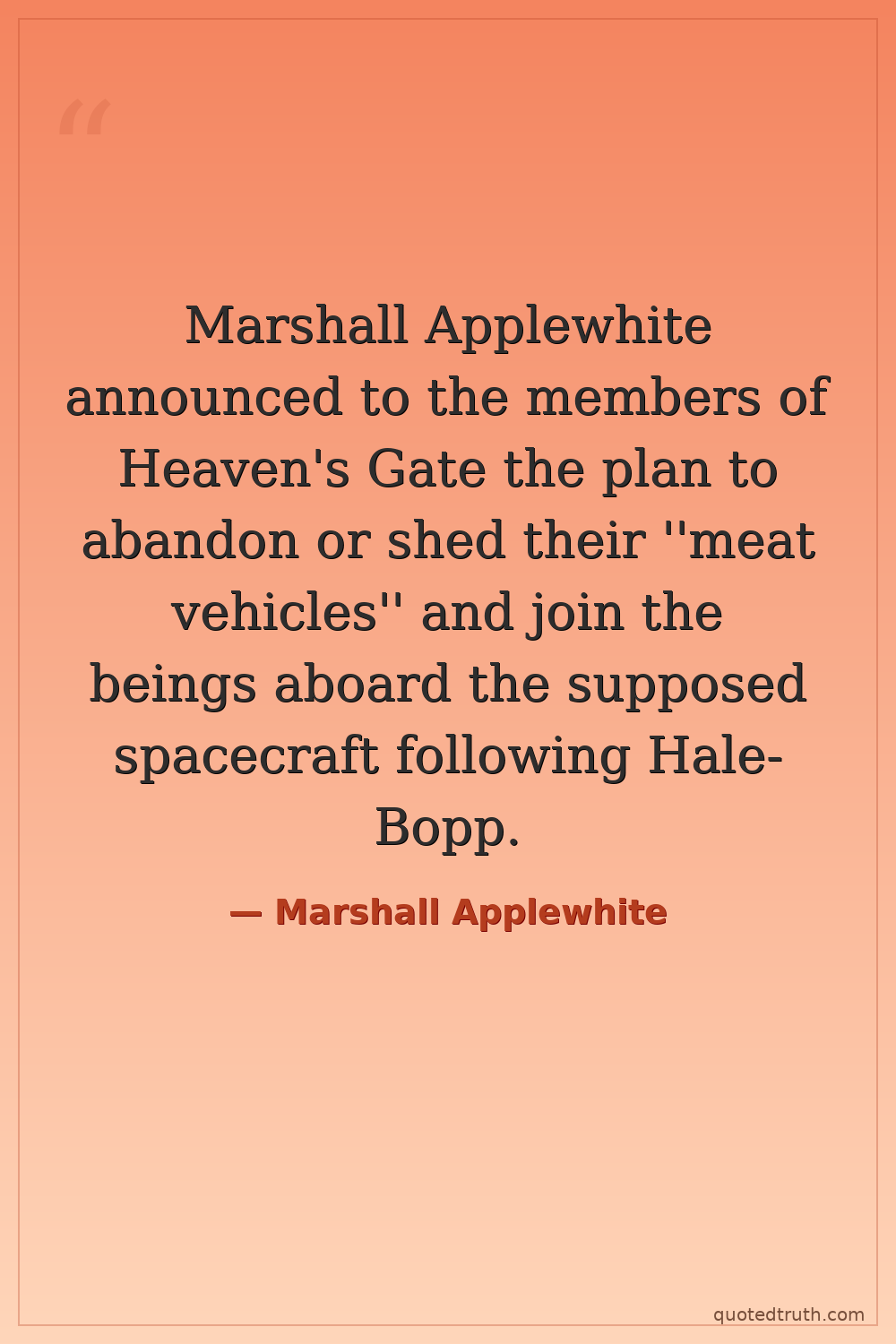 Marshall Applewhite announced to the members of Heaven's Gate the plan to abandon or shed their ''meat vehicles'' and join the beings aboard the supposed spacecraft following Hale-Bopp.