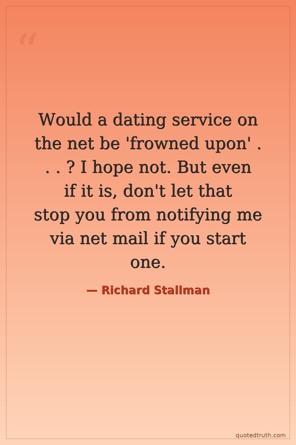Would a dating service on the net be 'frowned upon' . . . ? I hope not. But even if it is, don't let that stop you from notifying me via net mail if you start one.