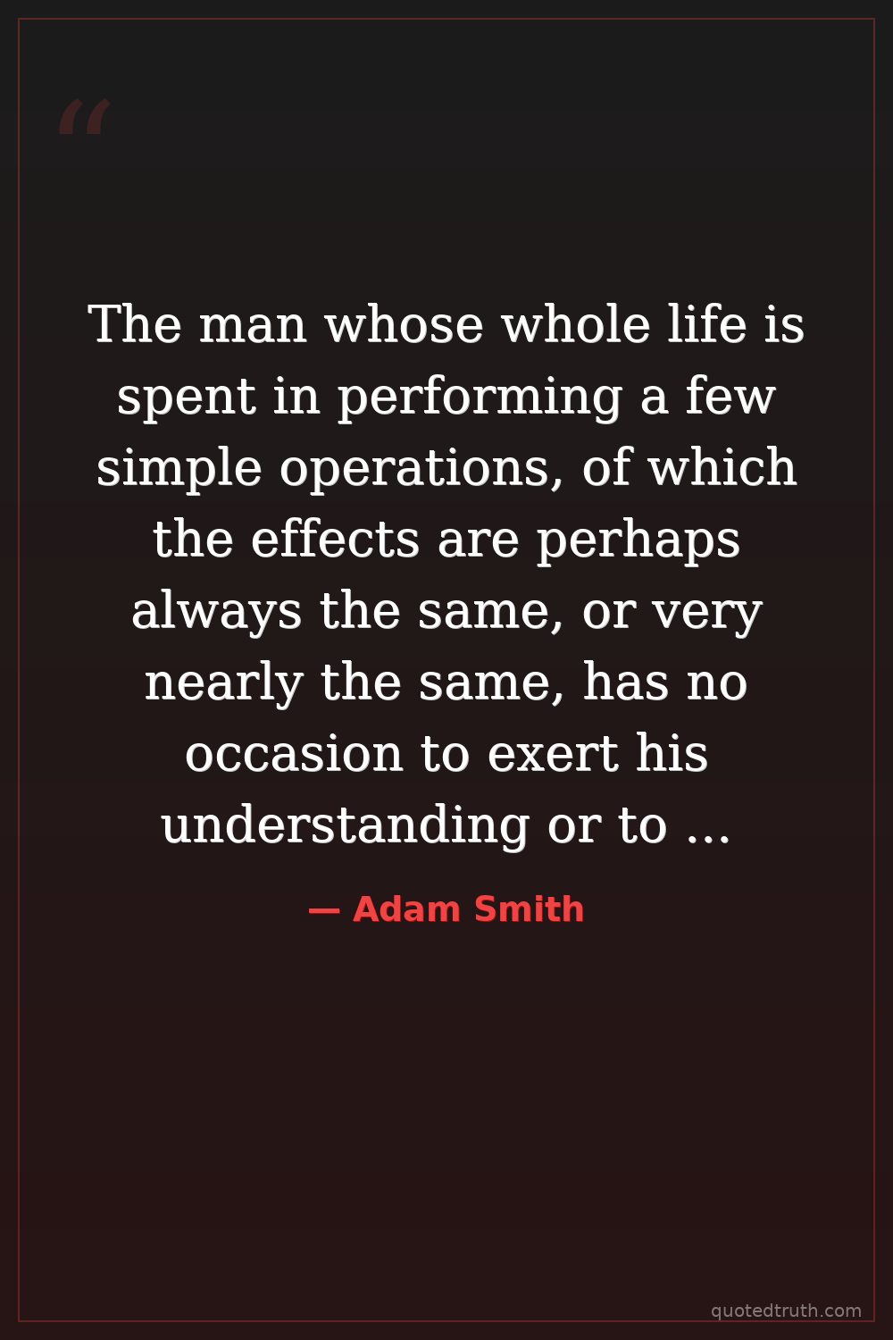 The man whose whole life is spent in performing a few simple operations, of which the effects are perhaps always the same, or very nearly the same, has no occasion to exert his understanding or to exercise his invention.