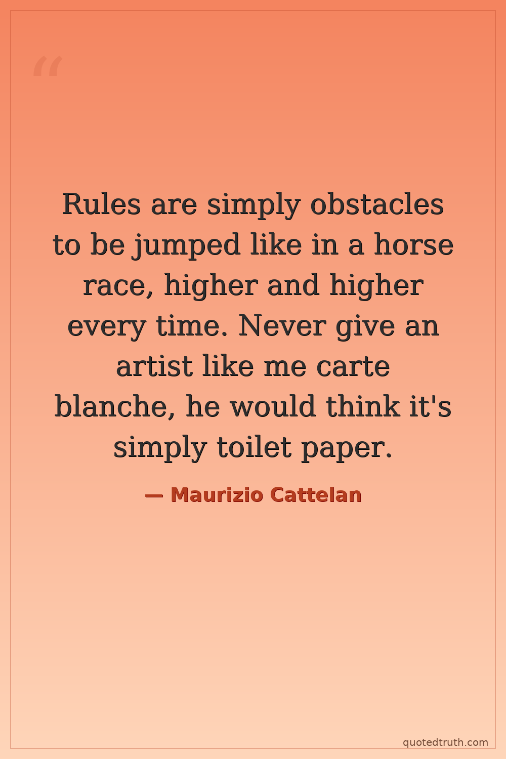 Rules are simply obstacles to be jumped like in a horse race, higher and higher every time. Never give an artist like me carte blanche, he would think it's simply toilet paper.