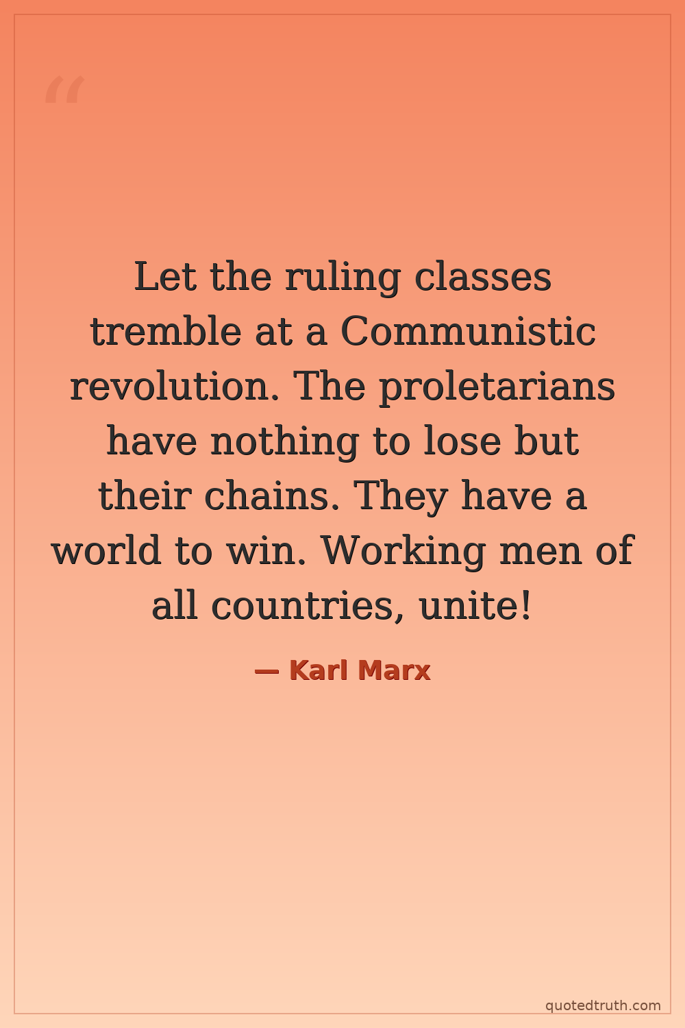 Let the ruling classes tremble at a Communistic revolution. The proletarians have nothing to lose but their chains. They have a world to win. Working men of all countries, unite!