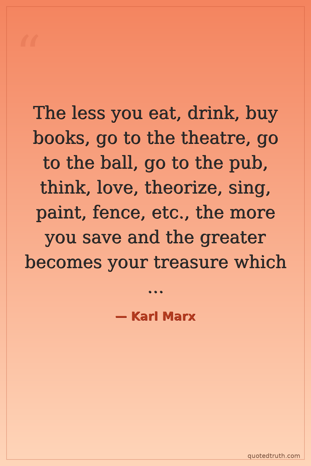The less you eat, drink, buy books, go to the theatre, go to the ball, go to the pub, think, love, theorize, sing, paint, fence, etc., the more you save and the greater becomes your treasure which neither moths nor dust will devour – your capital.