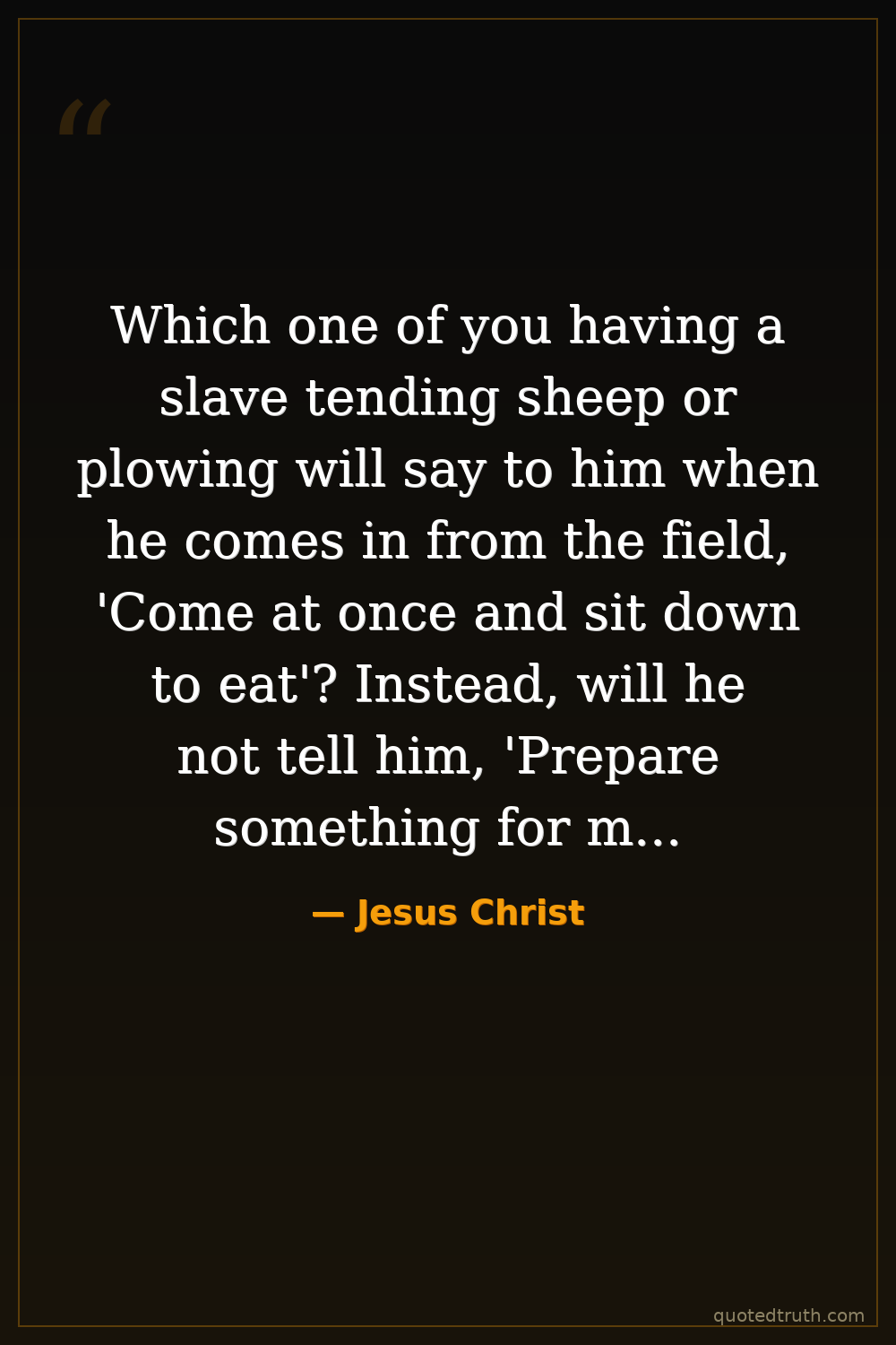 Which one of you having a slave tending sheep or plowing will say to him when he comes in from the field, 'Come at once and sit down to eat'? Instead, will he not tell him, 'Prepare something for me to eat, get ready, and serve me while I eat and drink; later you can eat and drink'? In the same way, when you have done all that you were commanded, you should say, 'We are good-for-nothing slaves; we've only done our duty.'