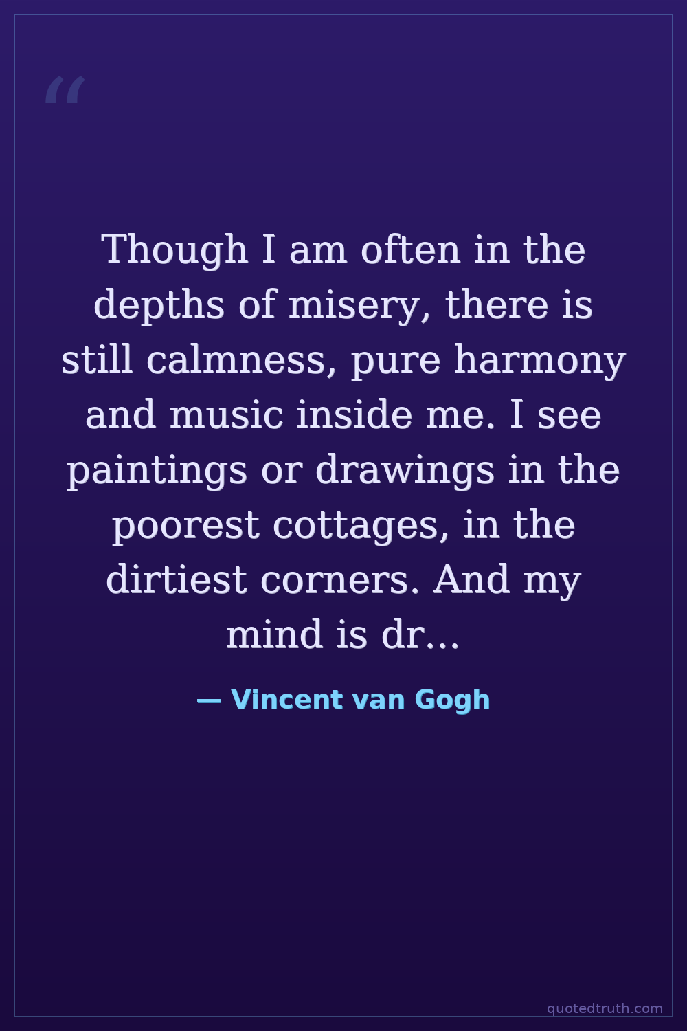 Though I am often in the depths of misery, there is still calmness, pure harmony and music inside me. I see paintings or drawings in the poorest cottages, in the dirtiest corners. And my mind is driven towards these things with an irresistible momentum.