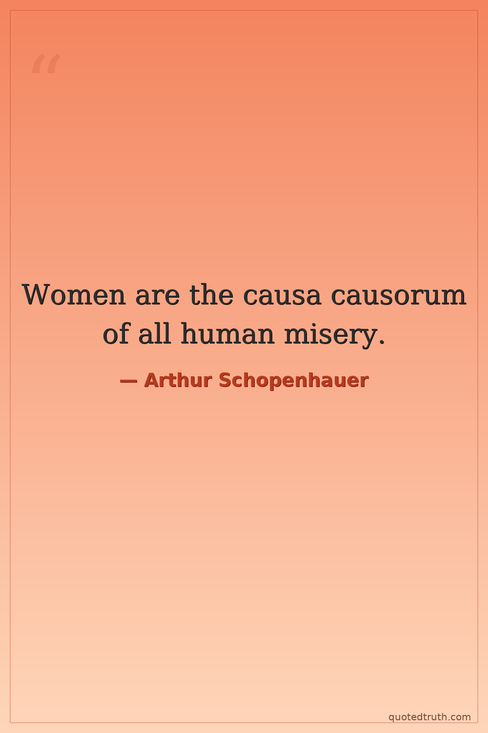 Shocking"The fundamental defect of the female character is a lack of the sense of justice. This arises from the fact that they are deficient in the faculty of reason and reflection, and are therefore unable to…"