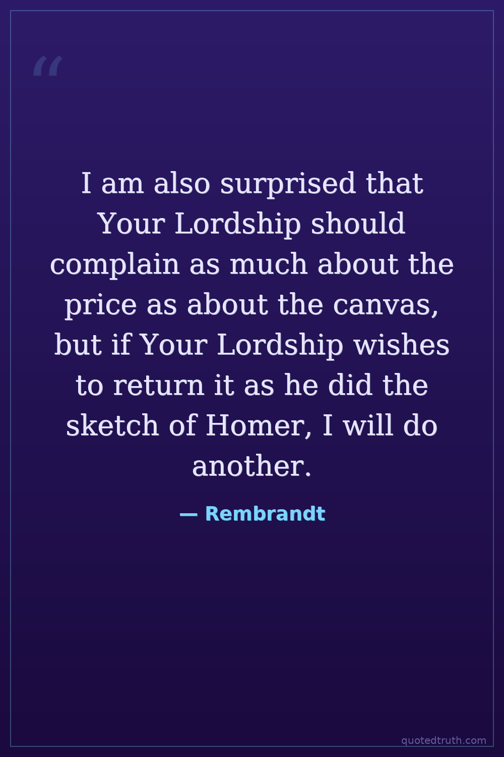 I am also surprised that Your Lordship should complain as much about the price as about the canvas, but if Your Lordship wishes to return it as he did the sketch of Homer, I will do another.