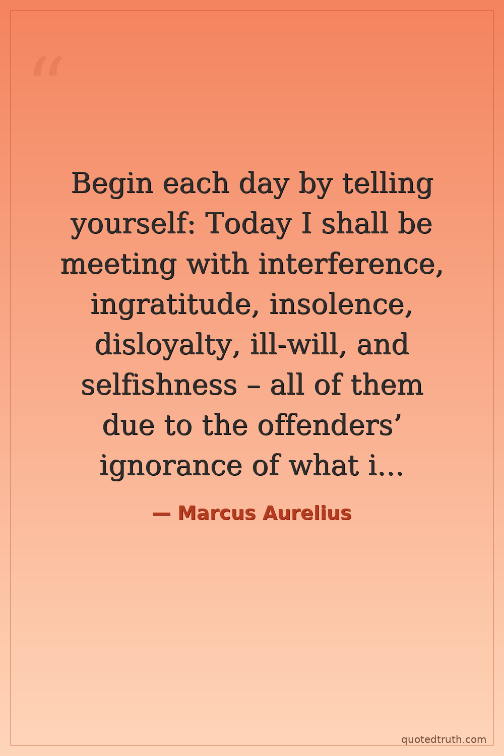 Begin each day by telling yourself: Today I shall be meeting with interference, ingratitude, insolence, disloyalty, ill-will, and selfishness – all of them due to the offenders’ ignorance of what is good and evil.