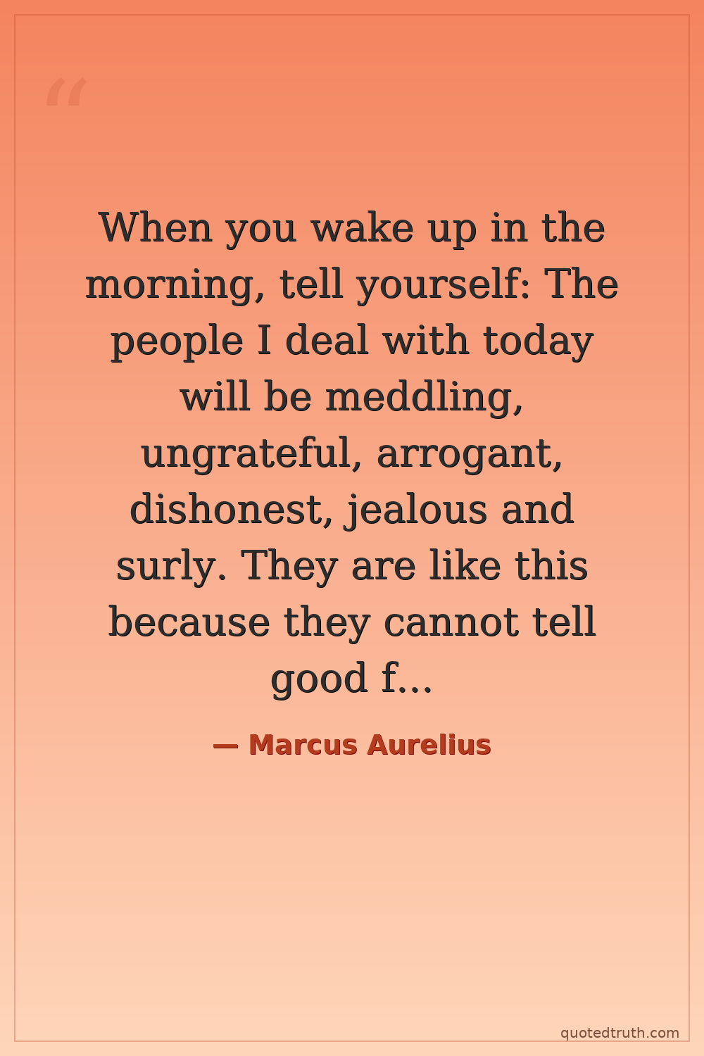 When you wake up in the morning, tell yourself: The people I deal with today will be meddling, ungrateful, arrogant, dishonest, jealous and surly. They are like this because they cannot tell good from evil. But I have seen the beauty of good, and the ugliness of evil, and have recognized that the wrongdoer has a nature related to my own – not of the same blood and birth, but the same mind, possessed of a share of the divine. And so I cannot be harmed by any of them, as no one can implicate me in ugliness. Nor can I feel angry at my relative, or hate him. We are made for cooperation, like feet, like hands, like eyelids, like the rows of upper and lower teeth. To work against each other is unnatural. And to feel anger at him, to turn your back on him: that is unnatural.