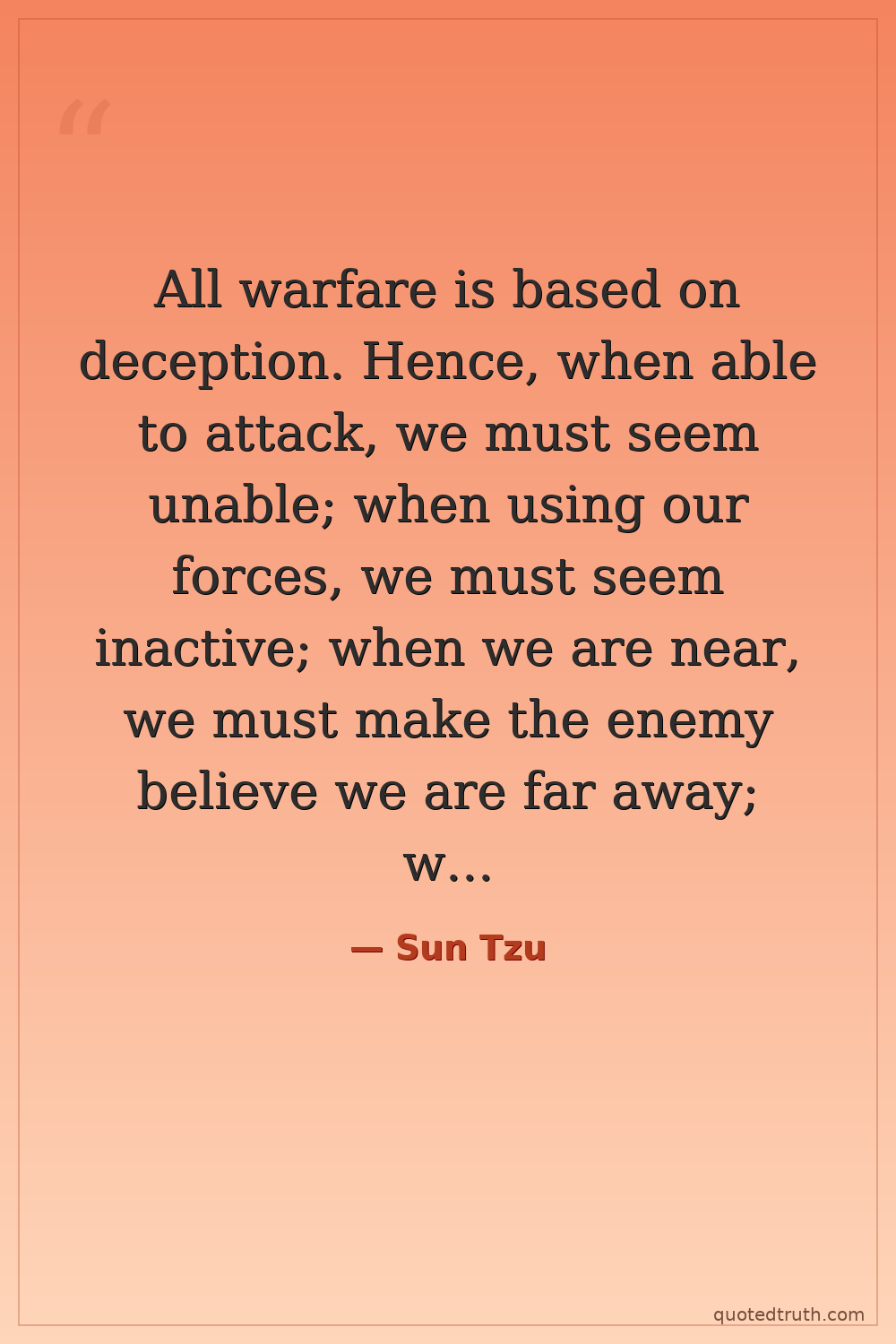 All warfare is based on deception. Hence, when able to attack, we must seem unable; when using our forces, we must seem inactive; when we are near, we must make the enemy believe we are far away; when far away, we must make him believe we are near.