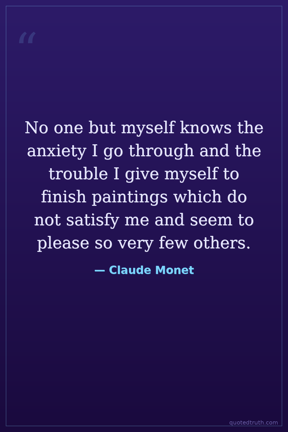 No one but myself knows the anxiety I go through and the trouble I give myself to finish paintings which do not satisfy me and seem to please so very few others.