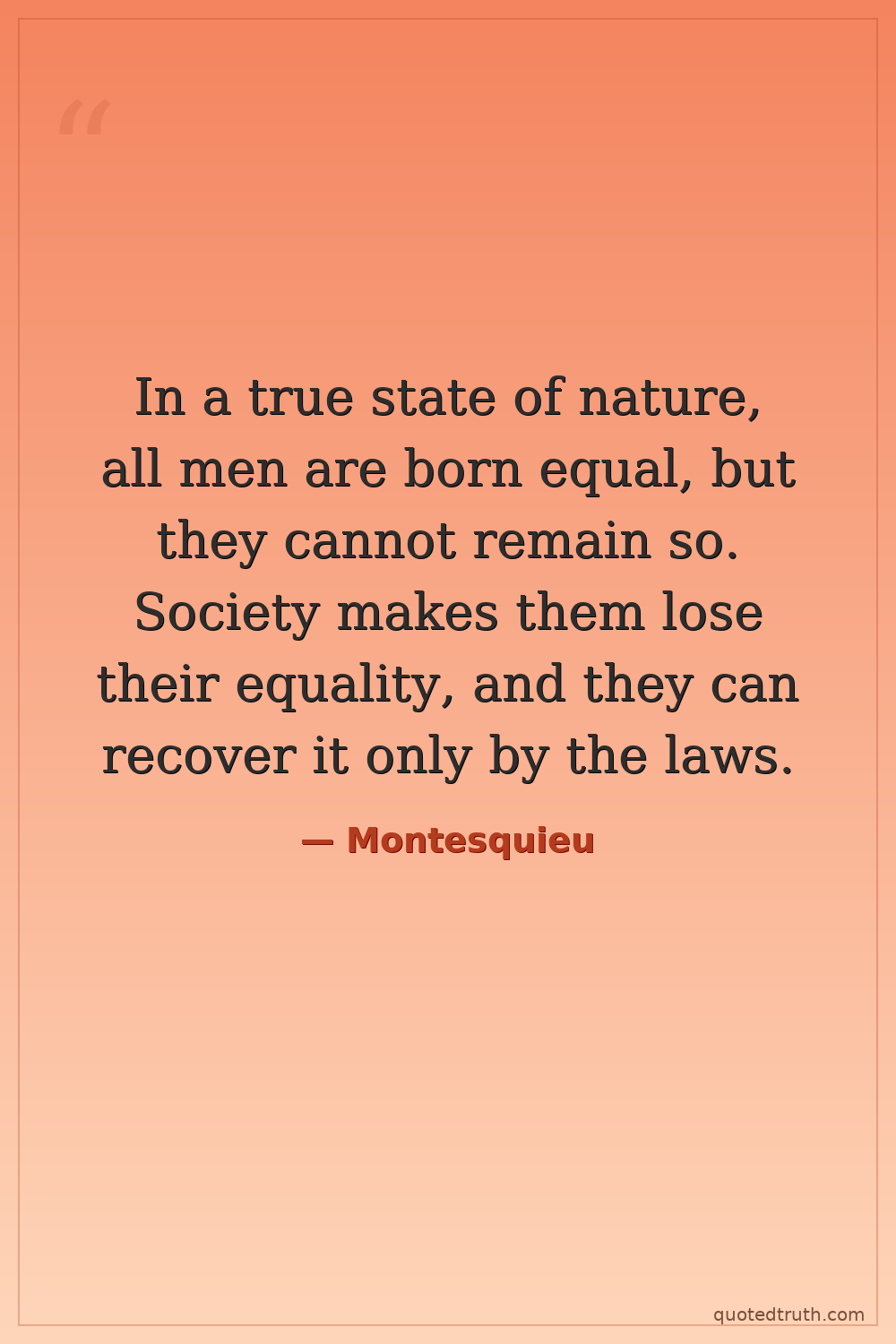 In a true state of nature, all men are born equal, but they cannot remain so. Society makes them lose their equality, and they can recover it only by the laws.
