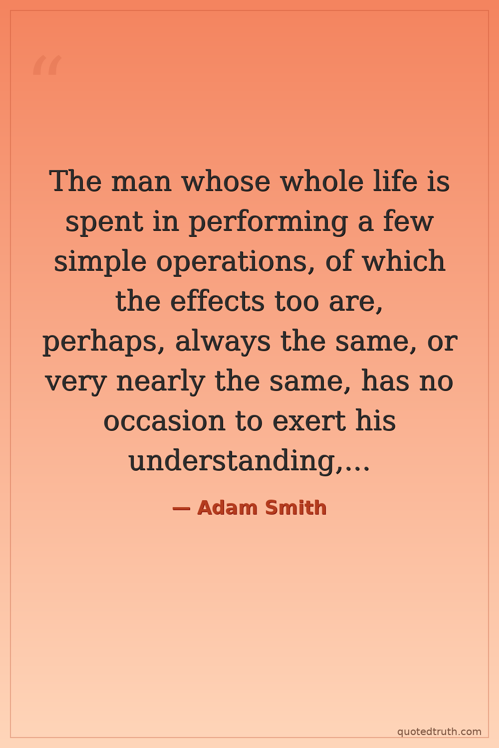 The man whose whole life is spent in performing a few simple operations, of which the effects too are, perhaps, always the same, or very nearly the same, has no occasion to exert his understanding, or to exercise his invention in finding out expedients for removing difficulties which never occur. He naturally loses, therefore, the habit of such exertion, and generally becomes as stupid and ignorant as it is possible for a human creature to become.