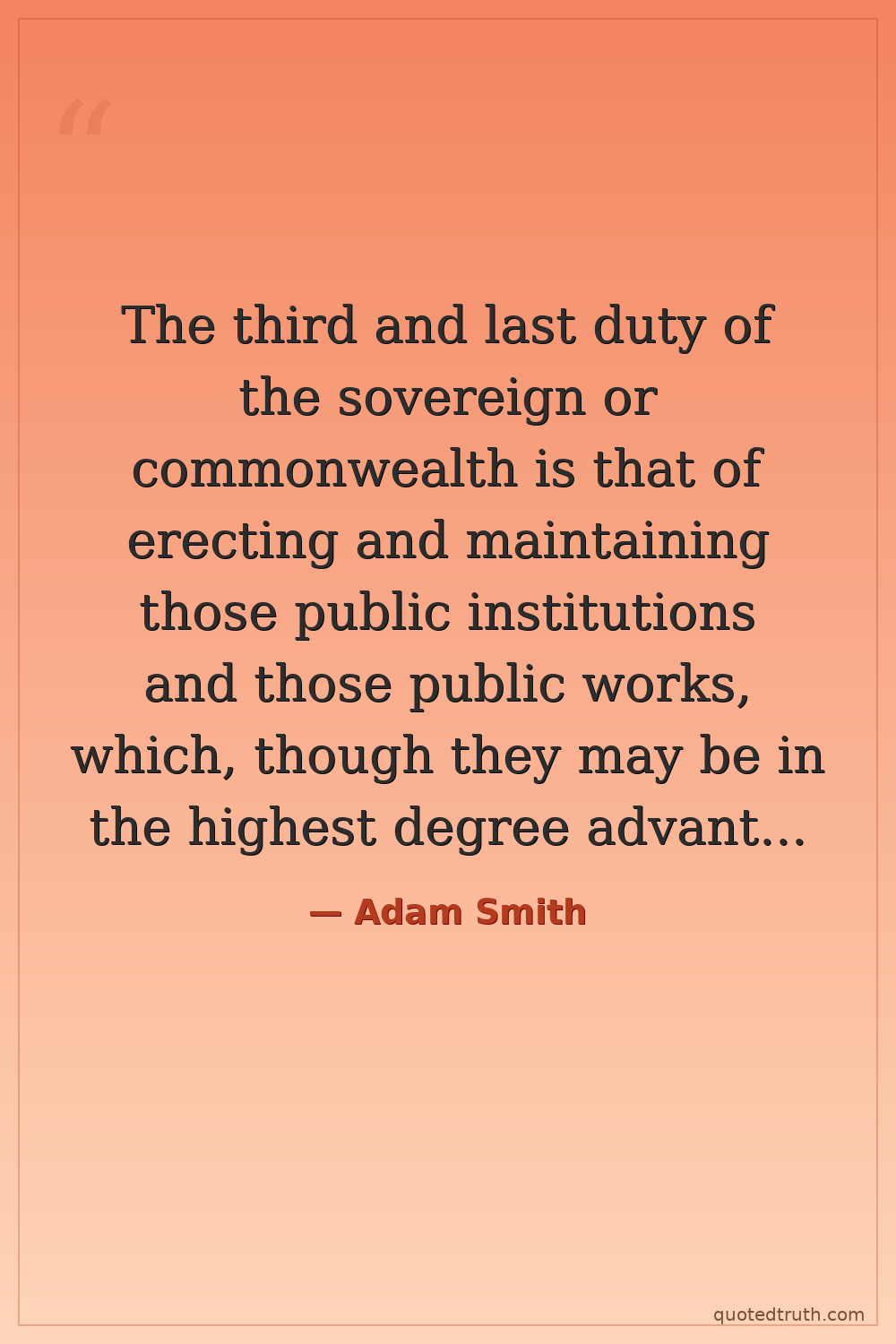 The third and last duty of the sovereign or commonwealth is that of erecting and maintaining those public institutions and those public works, which, though they may be in the highest degree advantageous to a great society, are, however, of such a nature, that the profit could never repay the expense to any individual or small number of individuals, and which it therefore cannot be expected that any individual or small number of individuals should erect or maintain.