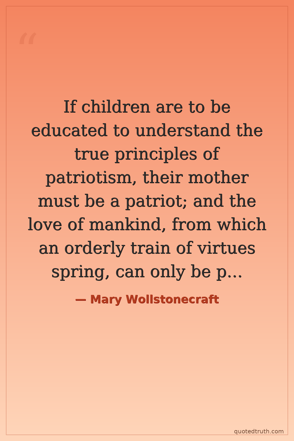 If children are to be educated to understand the true principles of patriotism, their mother must be a patriot; and the love of mankind, from which an orderly train of virtues spring, can only be produced by considering the moral and civil interest of society as of the first importance to the happiness of the individual.