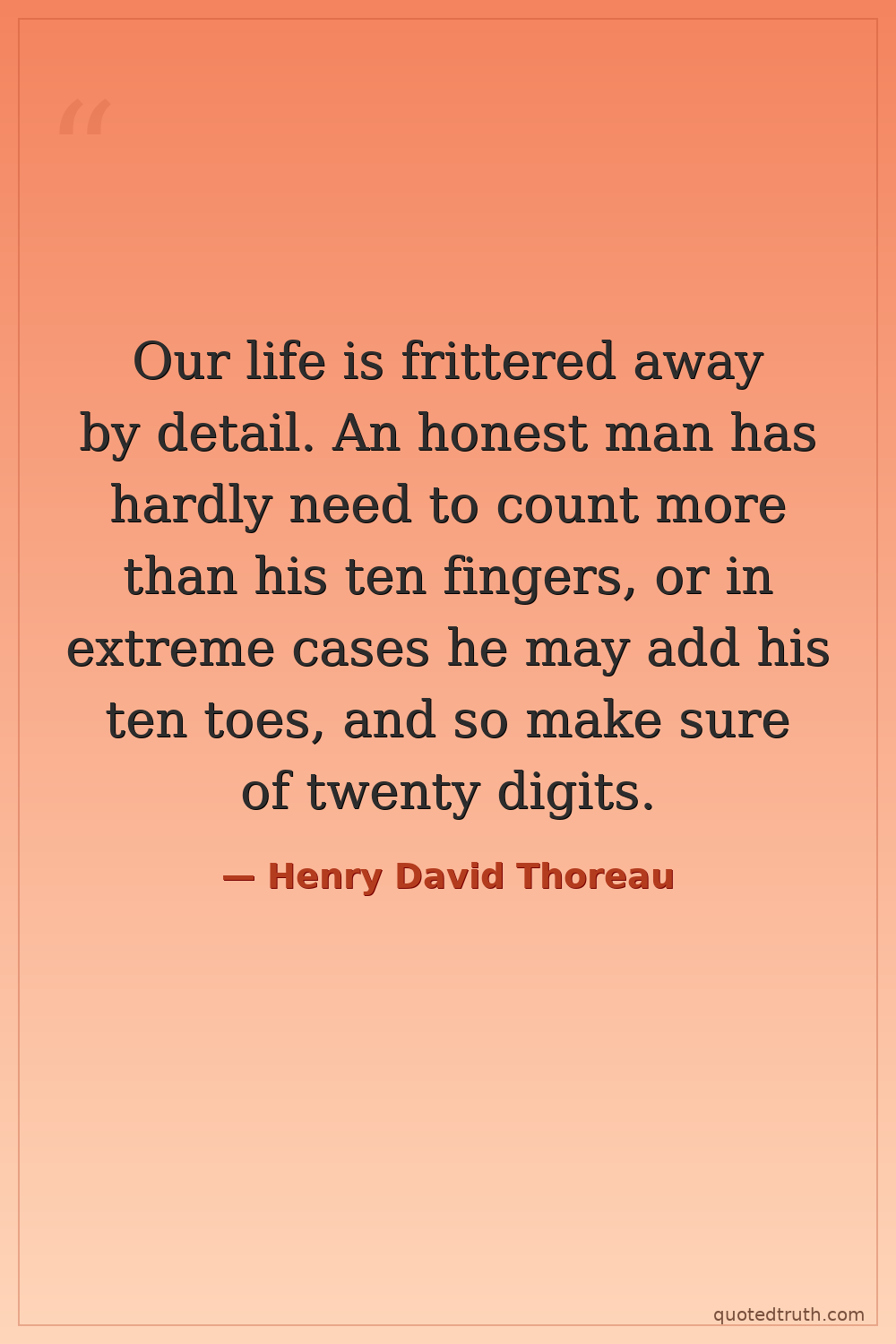 Our life is frittered away by detail. An honest man has hardly need to count more than his ten fingers, or in extreme cases he may add his ten toes, and so make sure of twenty digits.