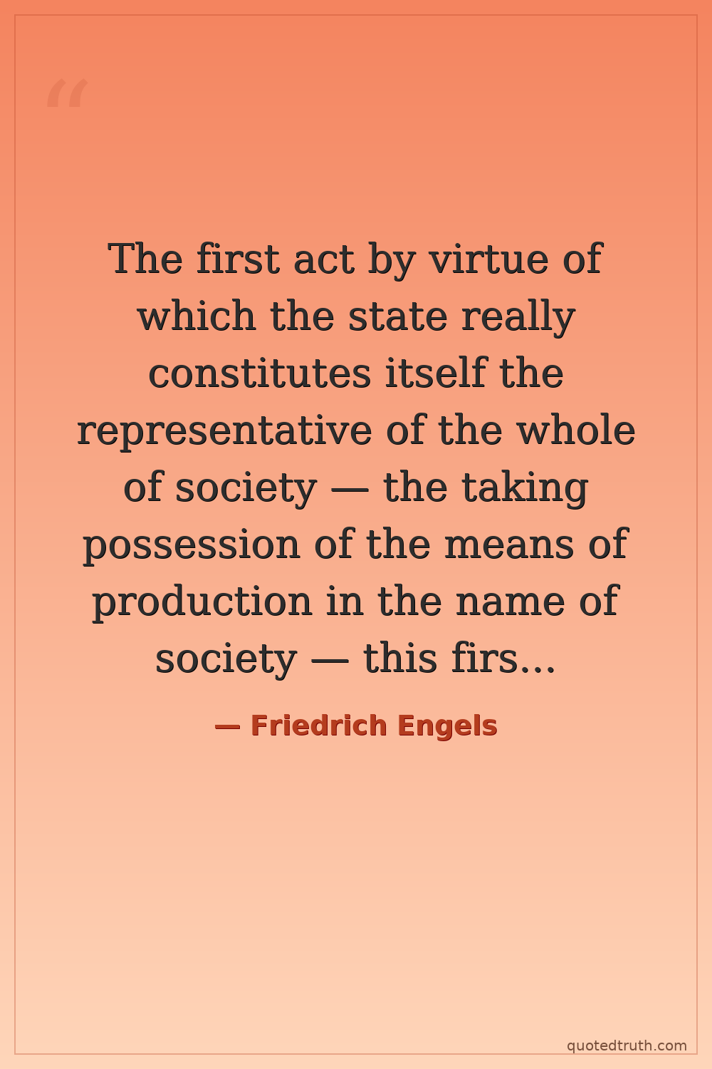 The first act by virtue of which the state really constitutes itself the representative of the whole of society — the taking possession of the means of production in the name of society — this first act is also its last as a state.