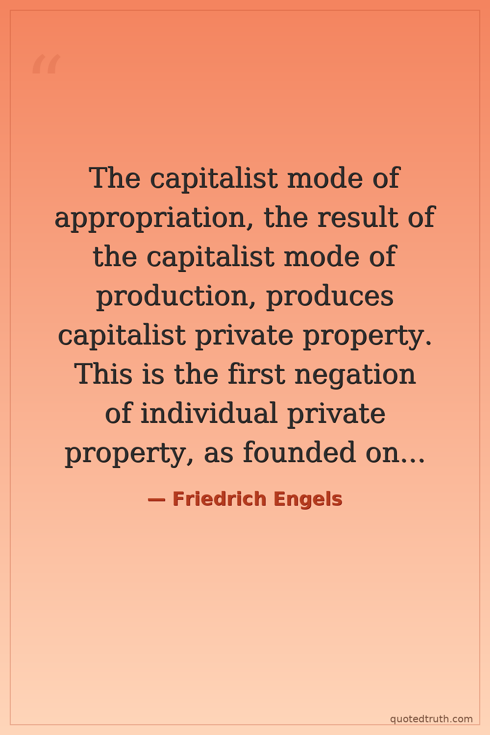 The capitalist mode of appropriation, the result of the capitalist mode of production, produces capitalist private property. This is the first negation of individual private property, as founded on the labour of the proprietor. But capitalist production begets, with the inexorability of a law of Nature, its own negation. It is the negation of negation.