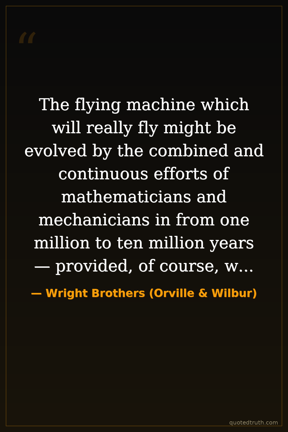 The flying machine which will really fly might be evolved by the combined and continuous efforts of mathematicians and mechanicians in from one million to ten million years — provided, of course, we can meanwhile eliminate such little drawbacks and embarrassments as the existing relation between weight and strength in inorganic materials. No doubt the problem has attractions for those it interests, but to the ordinary man it would seem as if effort might be employed more profitably.