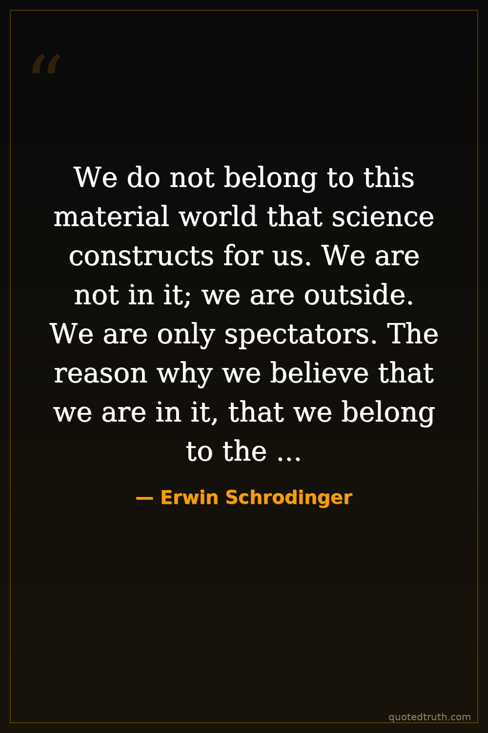 We do not belong to this material world that science constructs for us. We are not in it; we are outside. We are only spectators. The reason why we believe that we are in it, that we belong to the picture, is that our bodies are in the picture. Our bodies belong to it. Not only my own body, but those of my friends, also of my dog and cat and horse, and of all the other people and animals. And this is my only means of communicating with them.