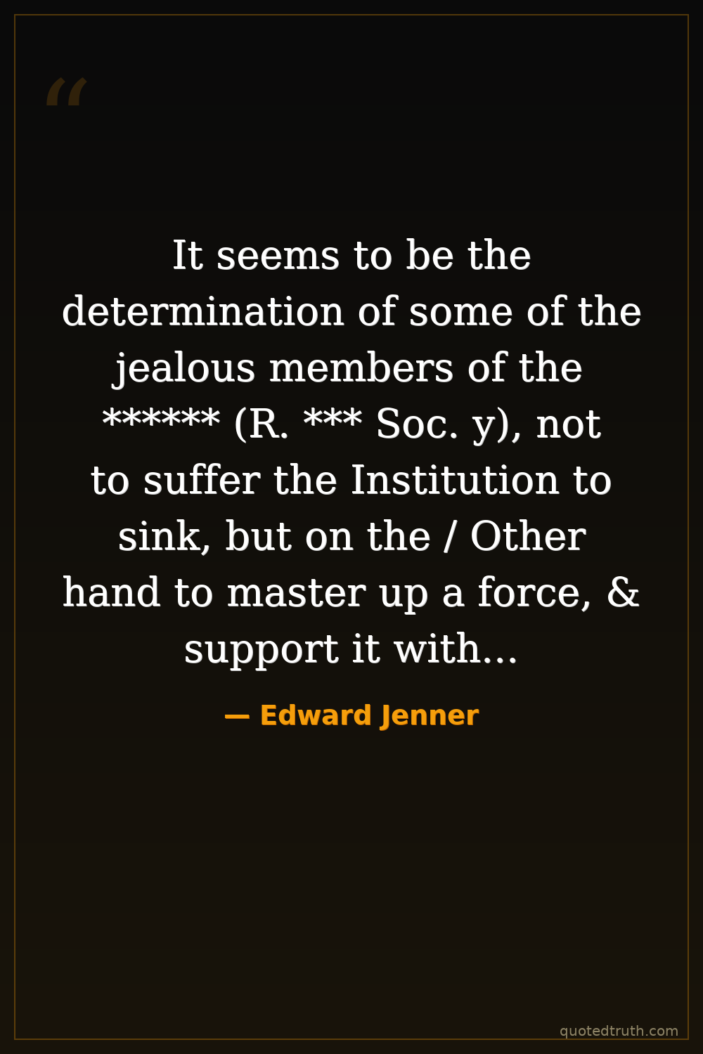 It seems to be the determination of some of the jealous members of the ****** (R. *** Soc. y), not to suffer the Institution to sink, but on the / Other hand to master up a force, & support it with all possible vigour. I, of course should be happy to see every *******(Institution?) flourish which had for its object the subjugation of the Smallpox, and was at the same time well conducted. It would be almost unnatural in me were I to shew a backwardness in giving Countenance to the *** Soc.