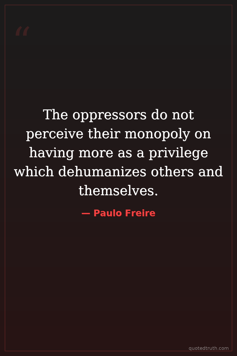 The oppressors do not perceive their monopoly on having more as a privilege which dehumanizes others and themselves.