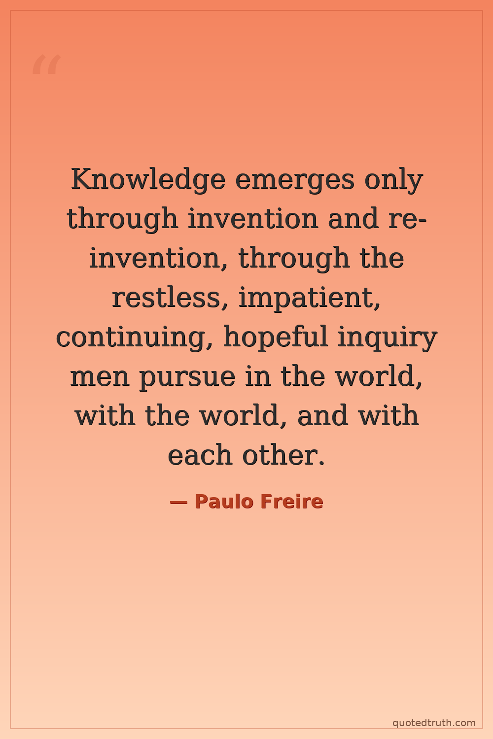 Knowledge emerges only through invention and re-invention, through the restless, impatient, continuing, hopeful inquiry men pursue in the world, with the world, and with each other.