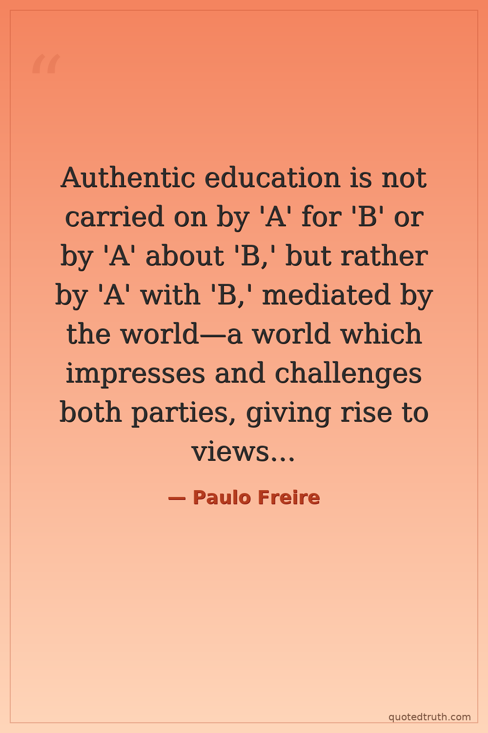 Authentic education is not carried on by 'A' for 'B' or by 'A' about 'B,' but rather by 'A' with 'B,' mediated by the world—a world which impresses and challenges both parties, giving rise to views and opinions about it.