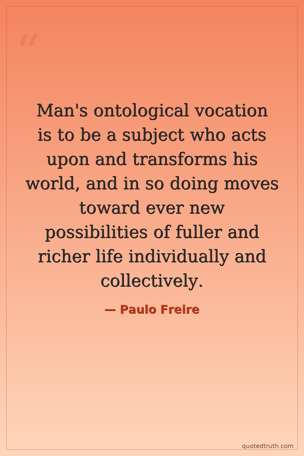 Man's ontological vocation is to be a subject who acts upon and transforms his world, and in so doing moves toward ever new possibilities of fuller and richer life individually and collectively.