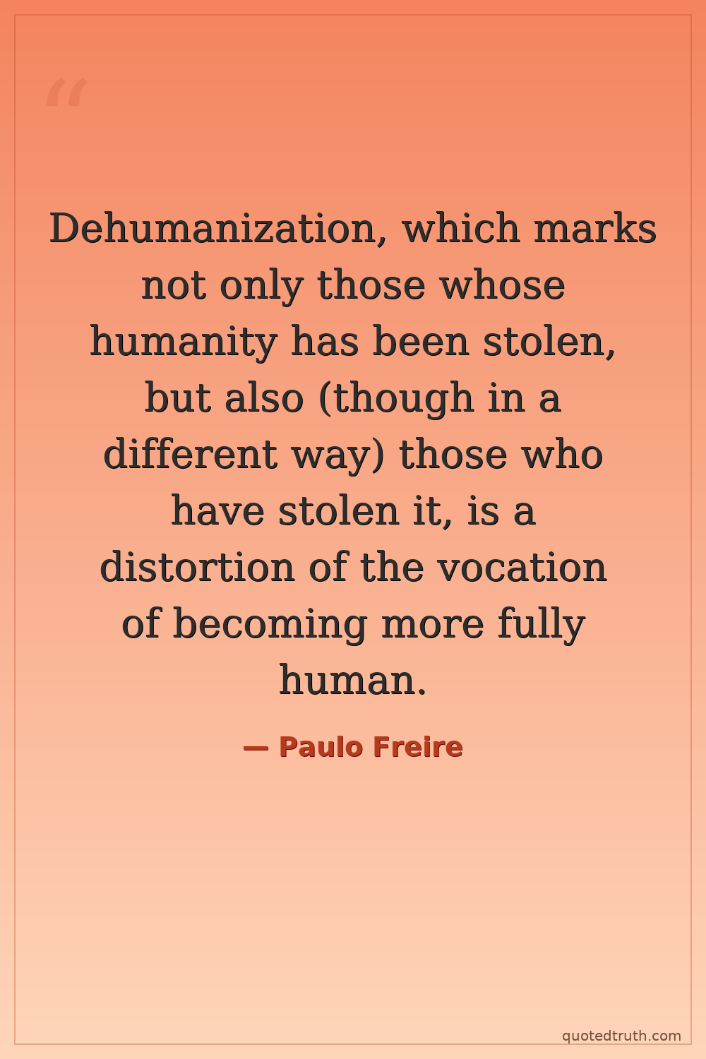 Dehumanization, which marks not only those whose humanity has been stolen, but also (though in a different way) those who have stolen it, is a distortion of the vocation of becoming more fully human.