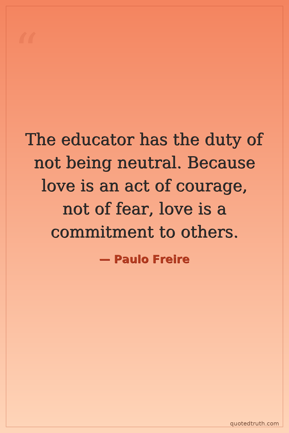 The educator has the duty of not being neutral. Because love is an act of courage, not of fear, love is a commitment to others.
