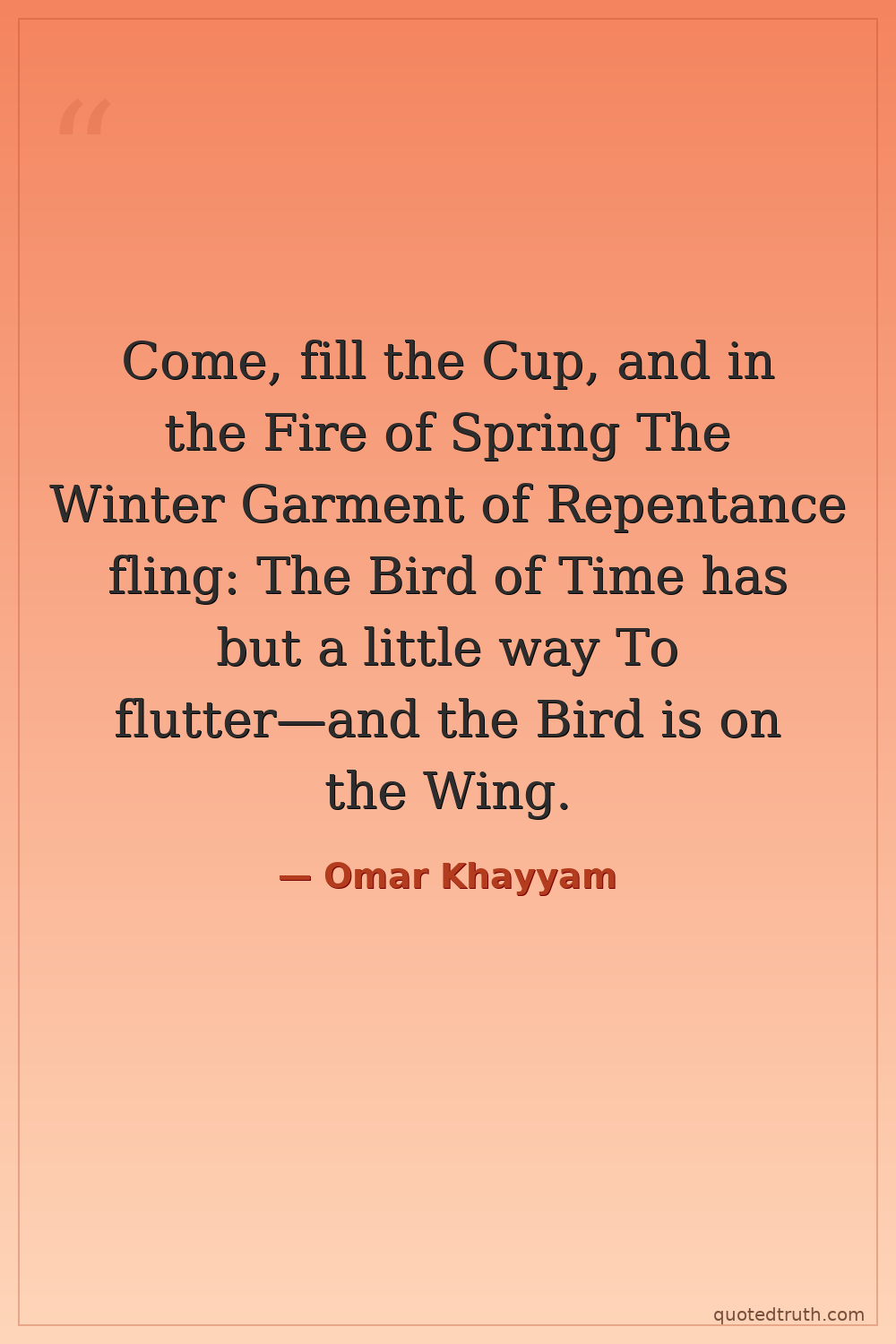 Come, fill the Cup, and in the Fire of Spring The Winter Garment of Repentance fling: The Bird of Time has but a little way To flutter—and the Bird is on the Wing.