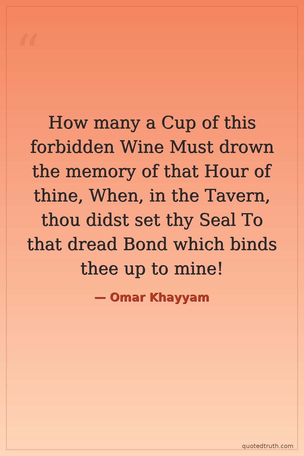 How many a Cup of this forbidden Wine Must drown the memory of that Hour of thine, When, in the Tavern, thou didst set thy Seal To that dread Bond which binds thee up to mine!