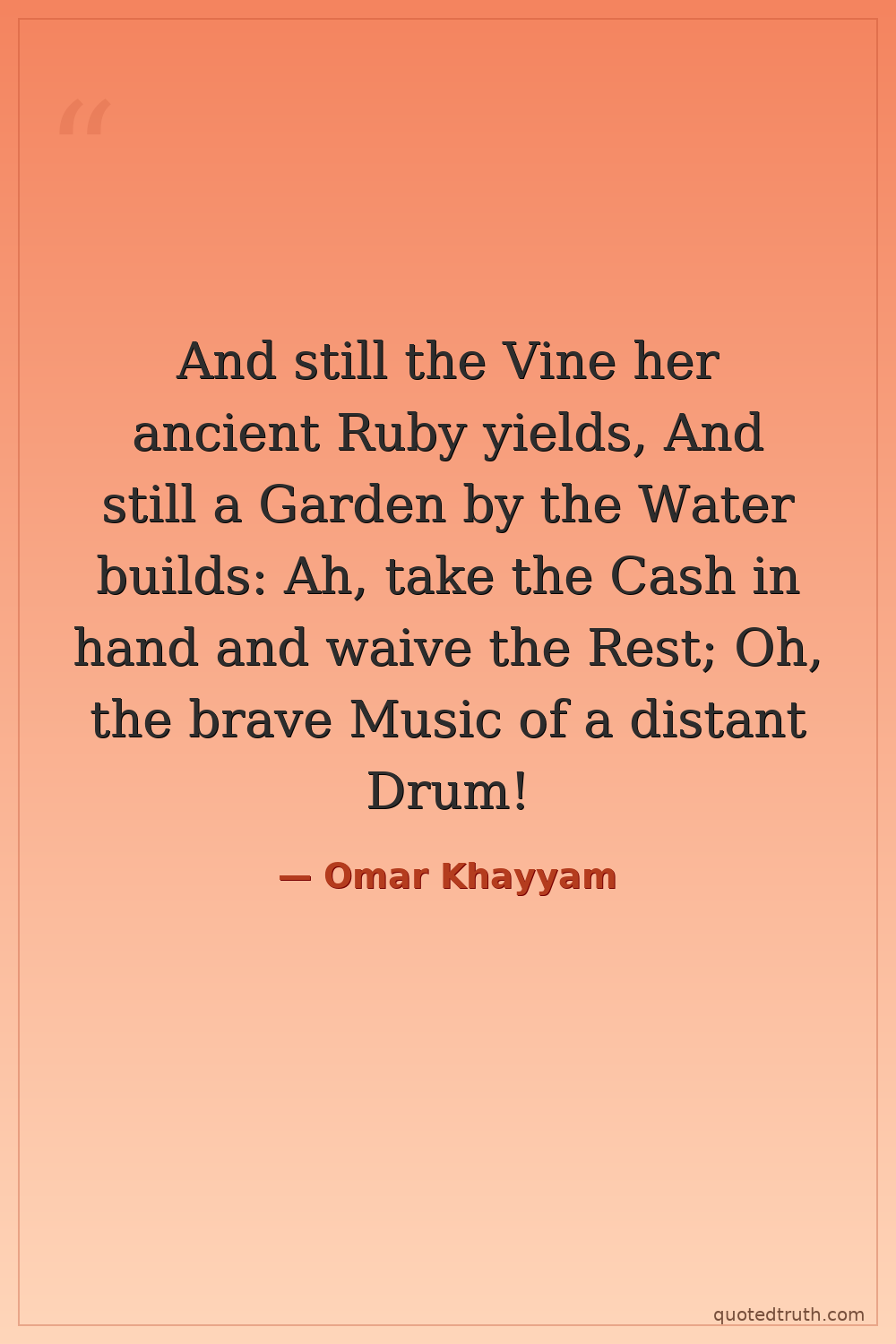 And still the Vine her ancient Ruby yields, And still a Garden by the Water builds: Ah, take the Cash in hand and waive the Rest; Oh, the brave Music of a distant Drum!