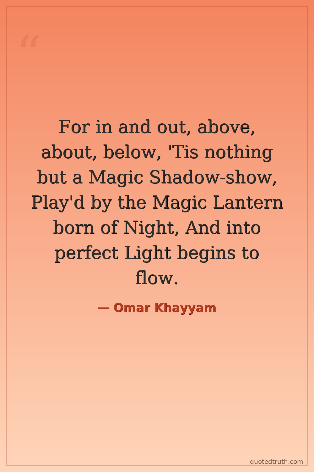 For in and out, above, about, below, 'Tis nothing but a Magic Shadow-show, Play'd by the Magic Lantern born of Night, And into perfect Light begins to flow.