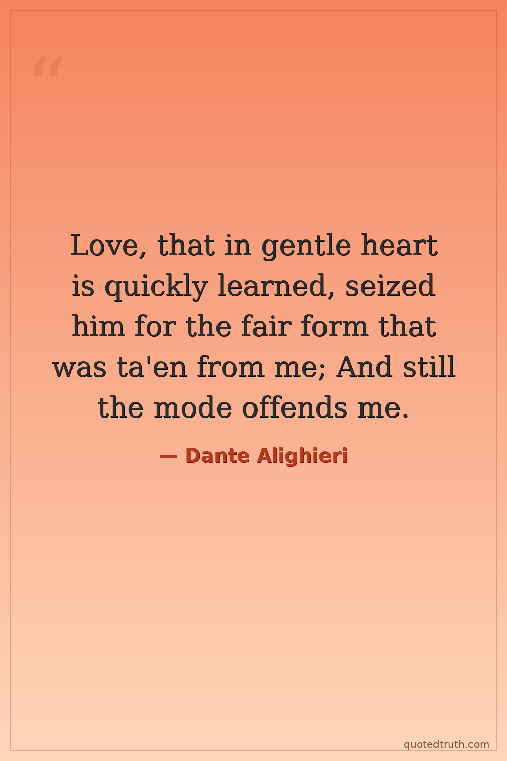 Love, that in gentle heart is quickly learned, seized him for the fair form that was ta'en from me; And still the mode offends me.
