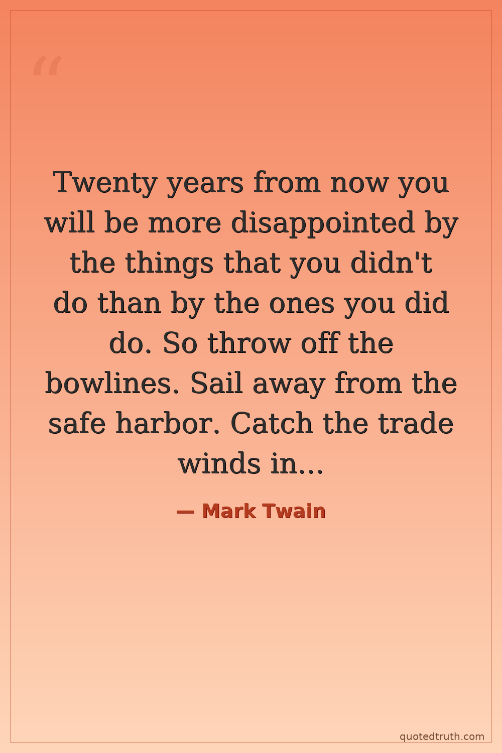 Twenty years from now you will be more disappointed by the things that you didn't do than by the ones you did do. So throw off the bowlines. Sail away from the safe harbor. Catch the trade winds in your sails. Explore. Dream. Discover.