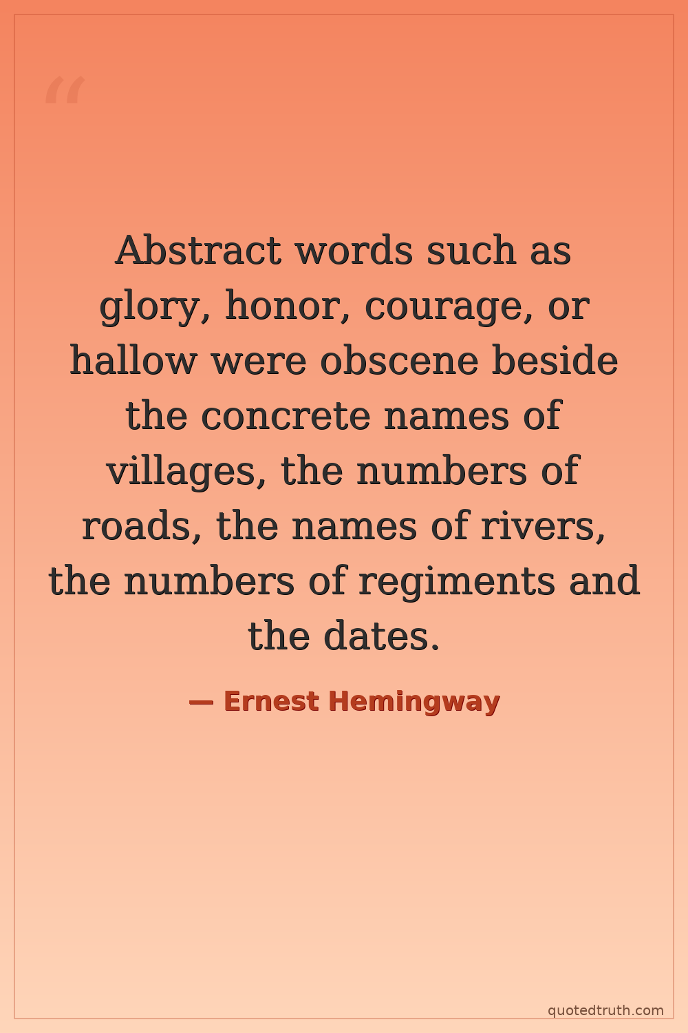 Abstract words such as glory, honor, courage, or hallow were obscene beside the concrete names of villages, the numbers of roads, the names of rivers, the numbers of regiments and the dates.