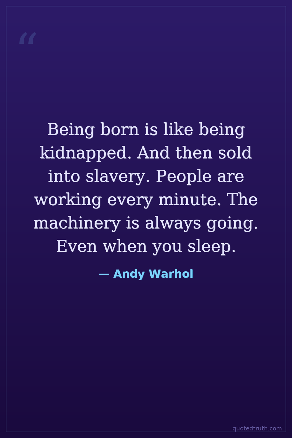 Being born is like being kidnapped. And then sold into slavery. People are working every minute. The machinery is always going. Even when you sleep.