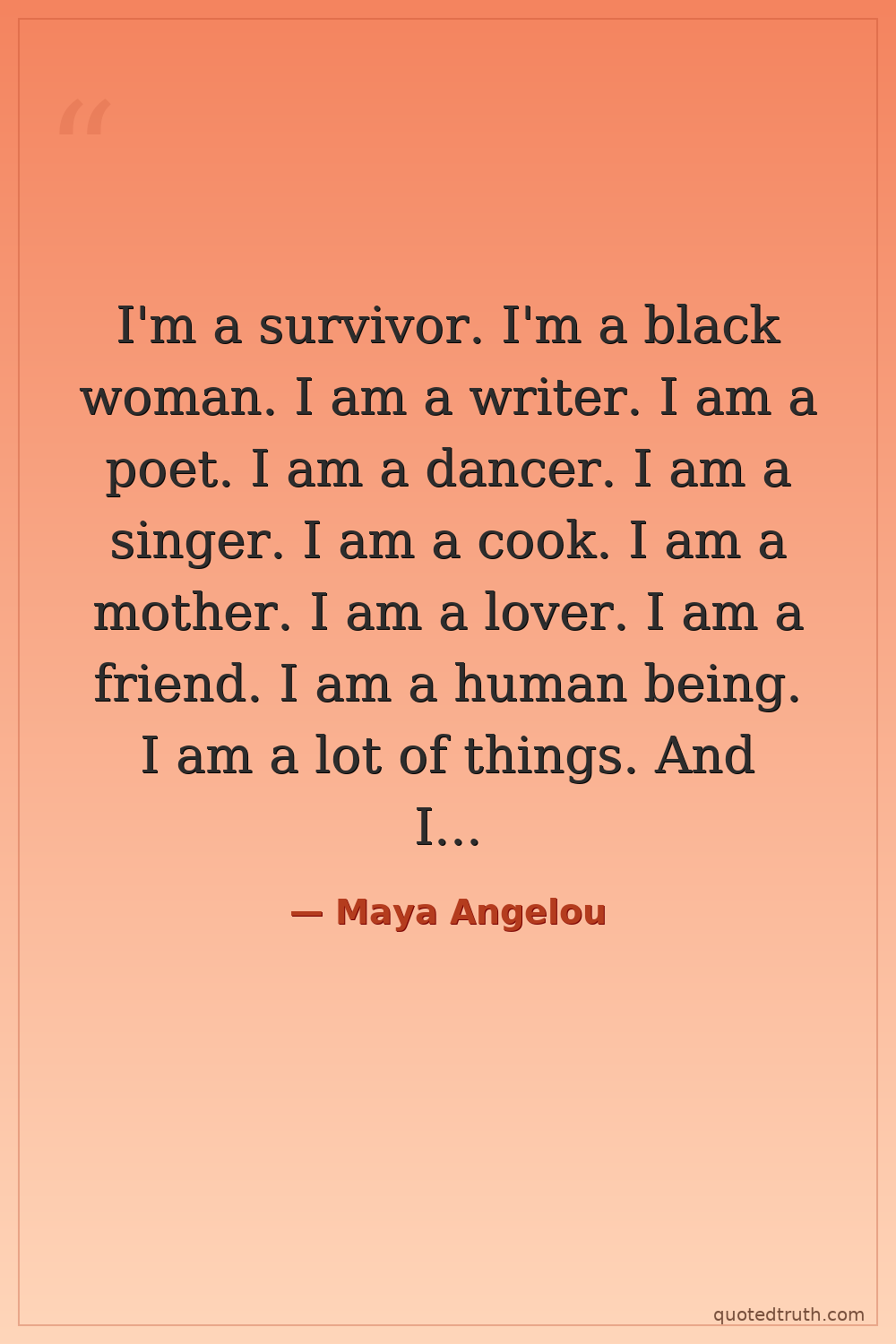 I'm a survivor. I'm a black woman. I am a writer. I am a poet. I am a dancer. I am a singer. I am a cook. I am a mother. I am a lover. I am a friend. I am a human being. I am a lot of things. And I'm still hungry.