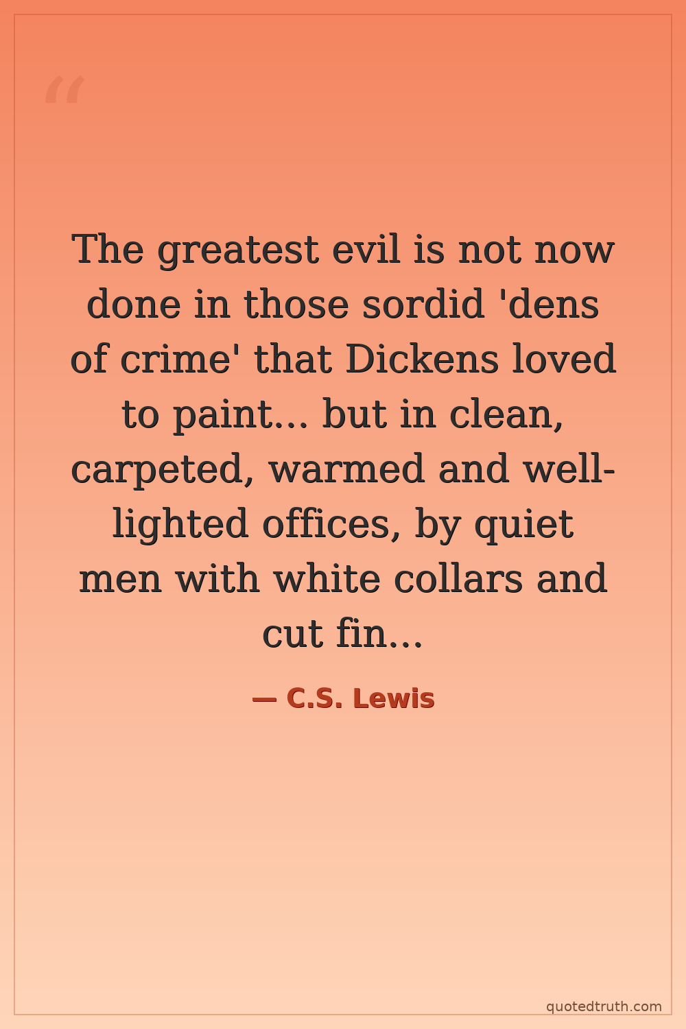 The greatest evil is not now done in those sordid 'dens of crime' that Dickens loved to paint... but in clean, carpeted, warmed and well-lighted offices, by quiet men with white collars and cut fingernails and smooth-shaven cheeks who do not need to raise their voice.
