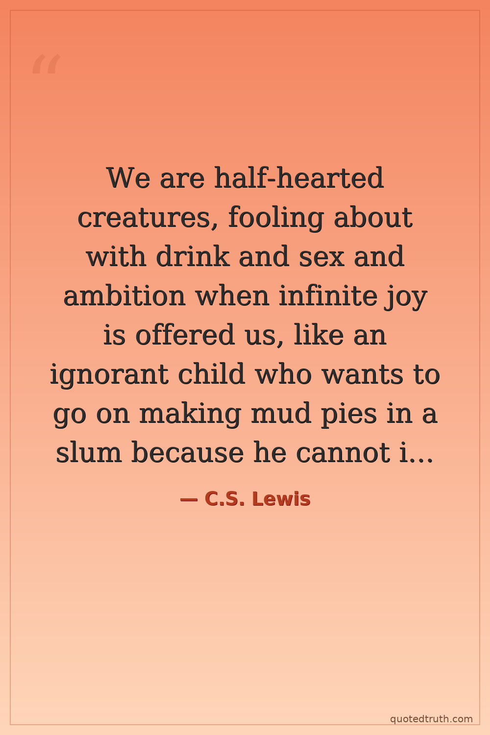 We are half-hearted creatures, fooling about with drink and sex and ambition when infinite joy is offered us, like an ignorant child who wants to go on making mud pies in a slum because he cannot imagine what is meant by the offer of a holiday at the sea.