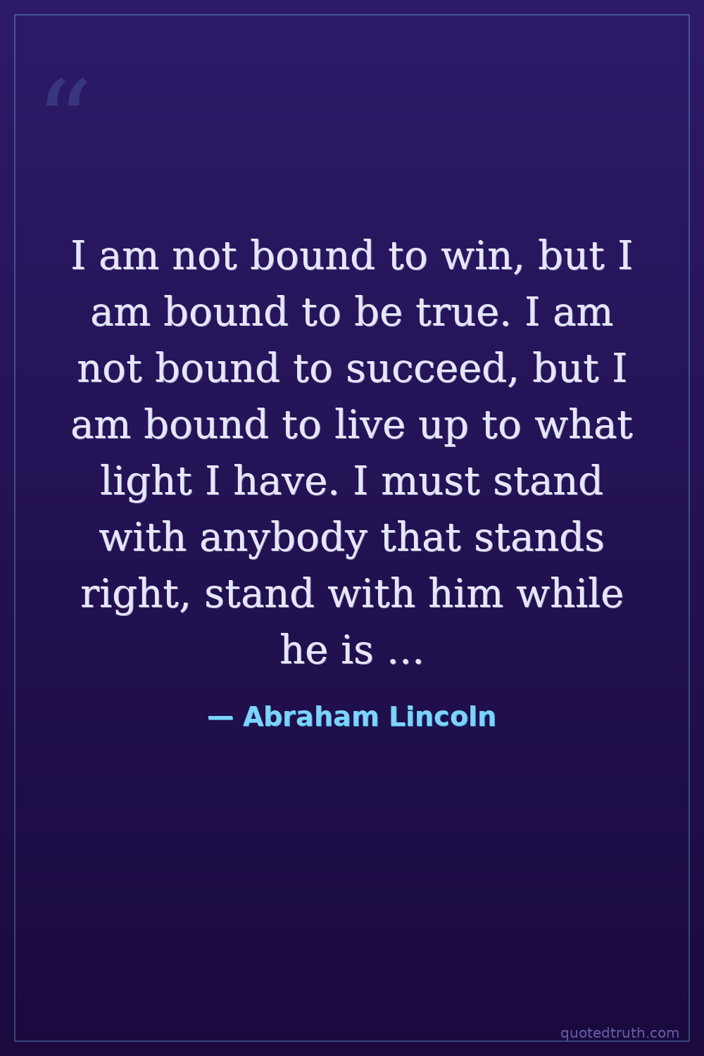 I am not bound to win, but I am bound to be true. I am not bound to succeed, but I am bound to live up to what light I have. I must stand with anybody that stands right, stand with him while he is right, and part with him when he goes wrong.