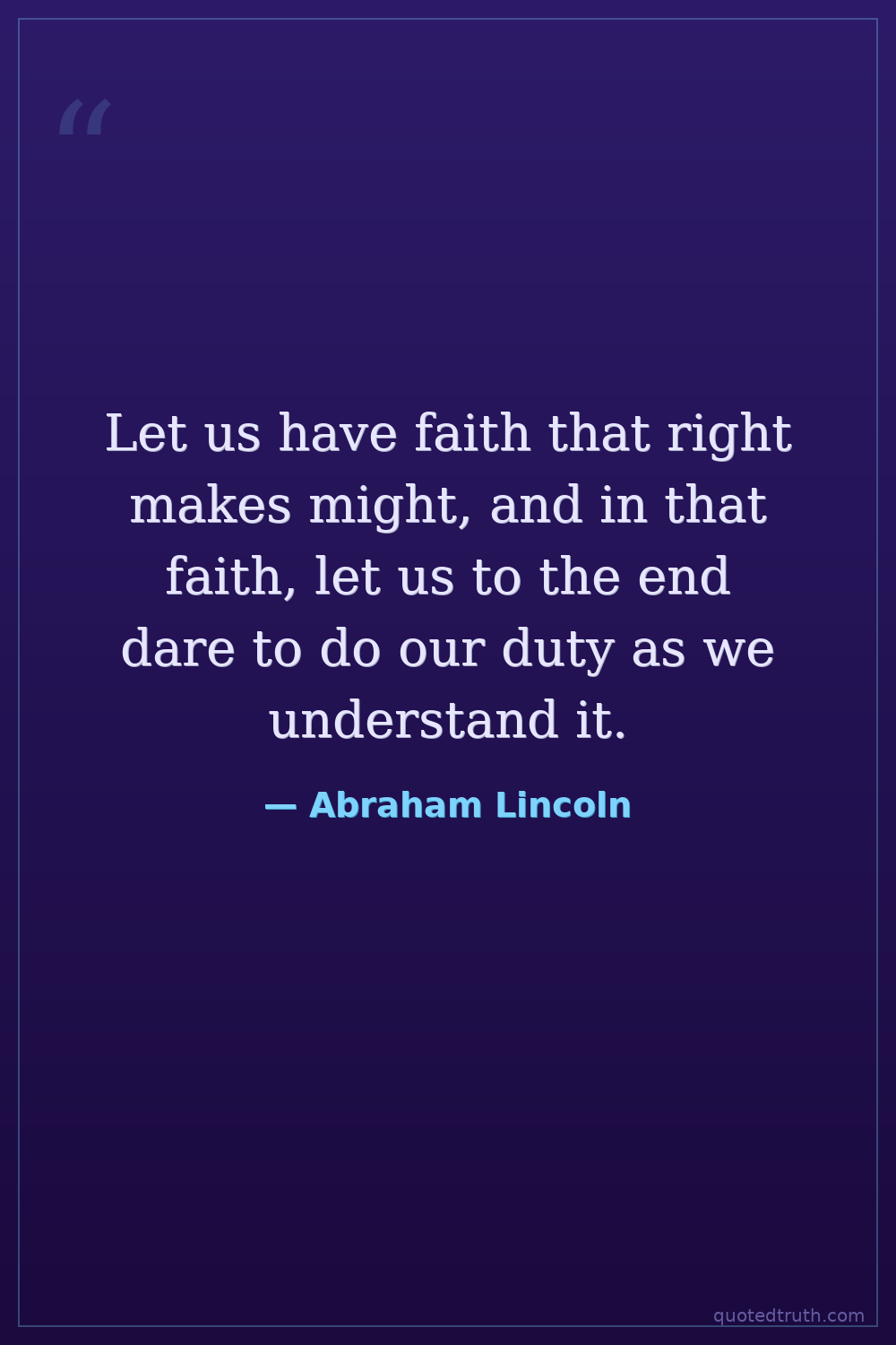 Let us have faith that right makes might, and in that faith, let us to the end dare to do our duty as we understand it.
