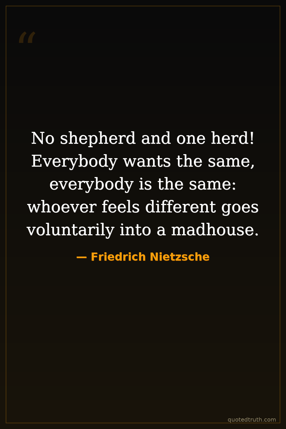 No shepherd and one herd! Everybody wants the same, everybody is the same: whoever feels different goes voluntarily into a madhouse.