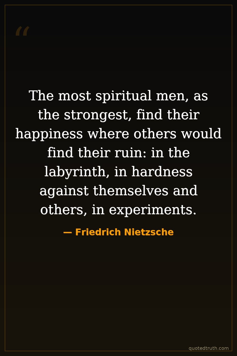 The most spiritual men, as the strongest, find their happiness where others would find their ruin: in the labyrinth, in hardness against themselves and others, in experiments.