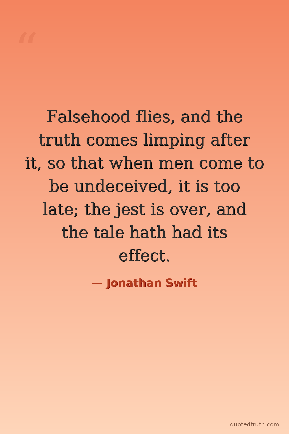 Falsehood flies, and the truth comes limping after it, so that when men come to be undeceived, it is too late; the jest is over, and the tale hath had its effect.