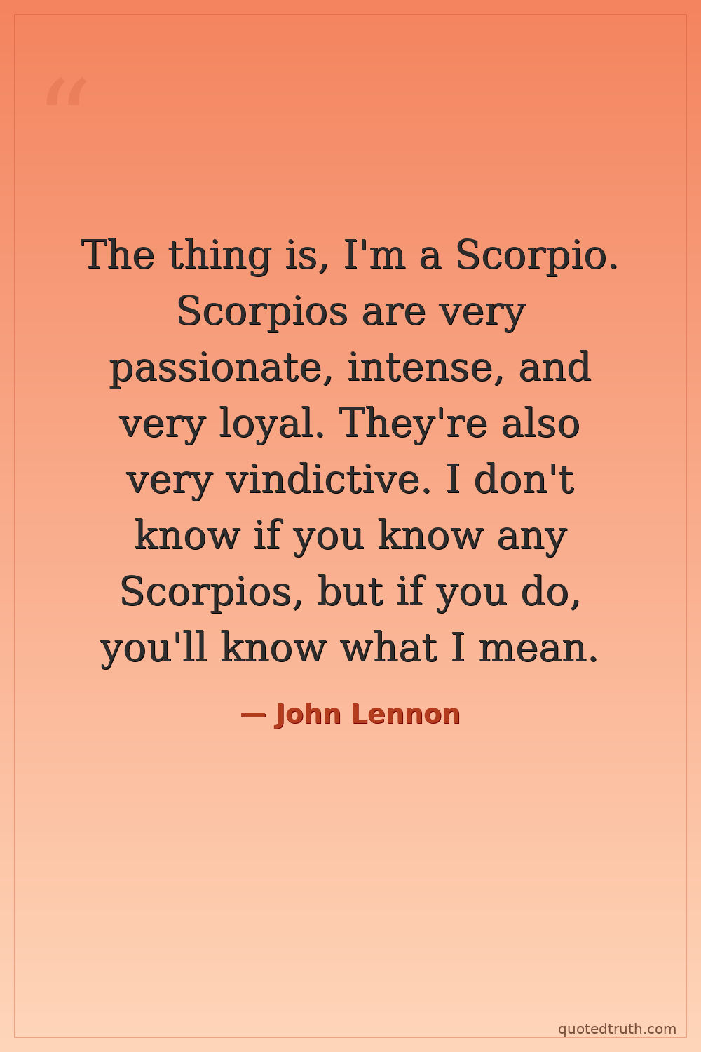 The thing is, I'm a Scorpio. Scorpios are very passionate, intense, and very loyal. They're also very vindictive. I don't know if you know any Scorpios, but if you do, you'll know what I mean.